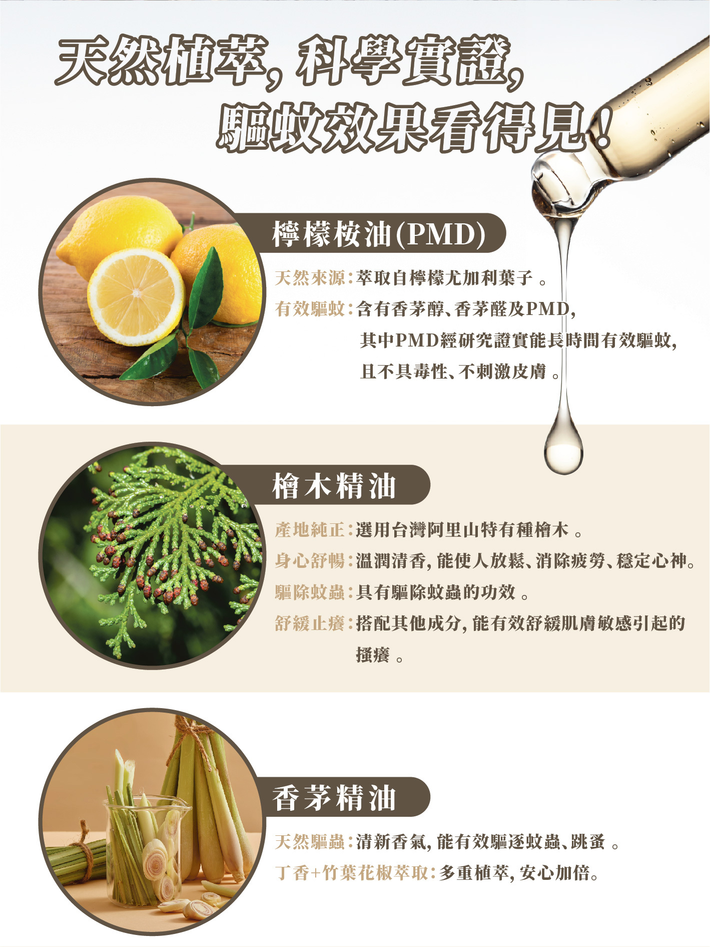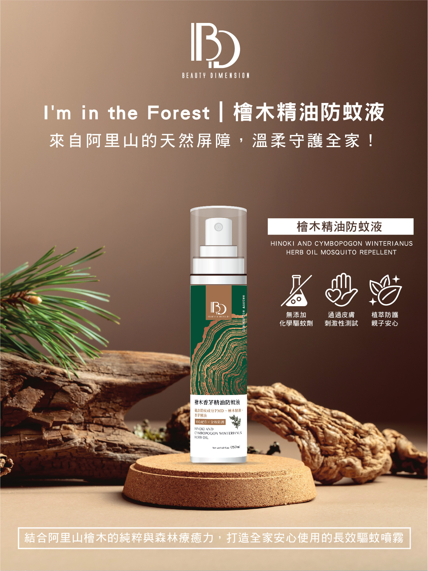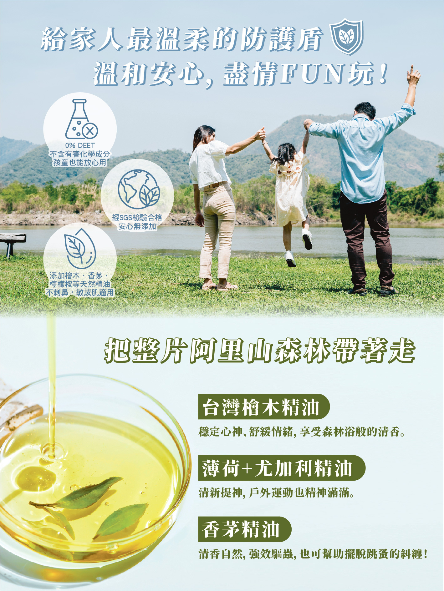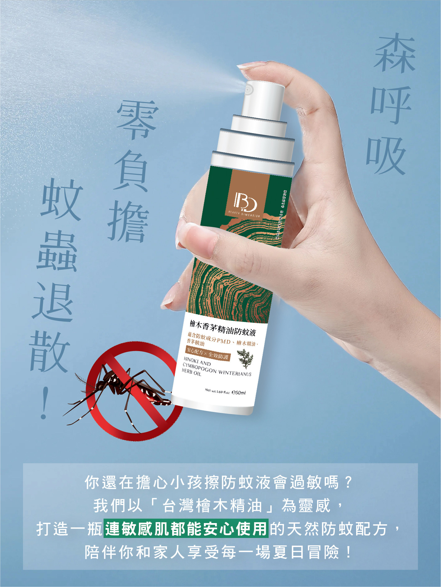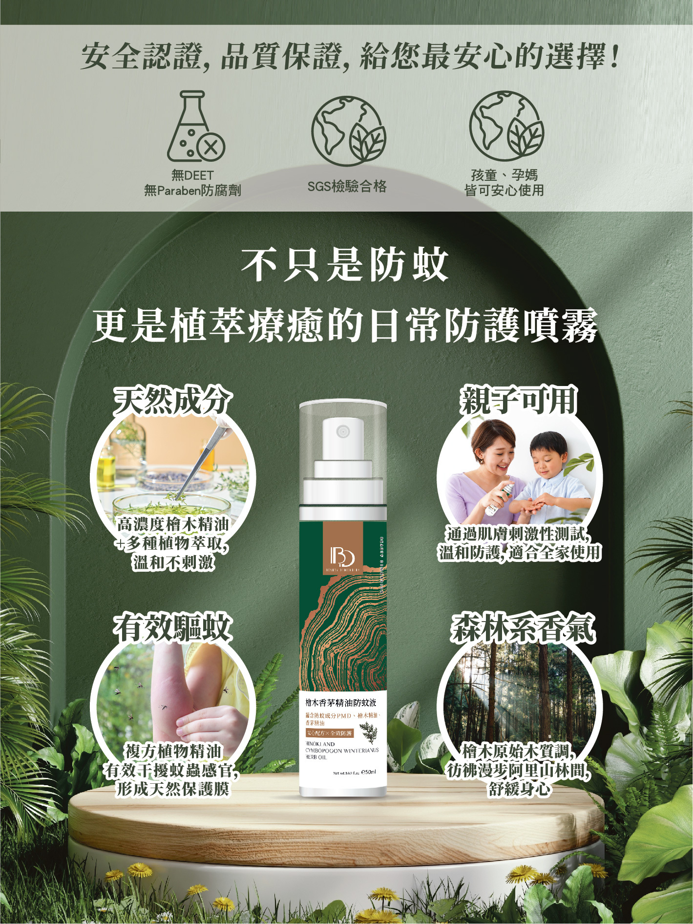 嚴選台灣原生檜木精油與香茅草本植萃,無添加DEET,溫和不刺激。