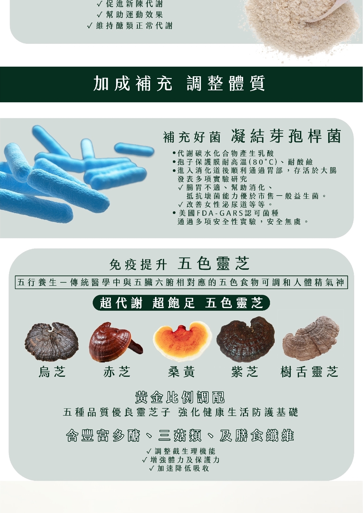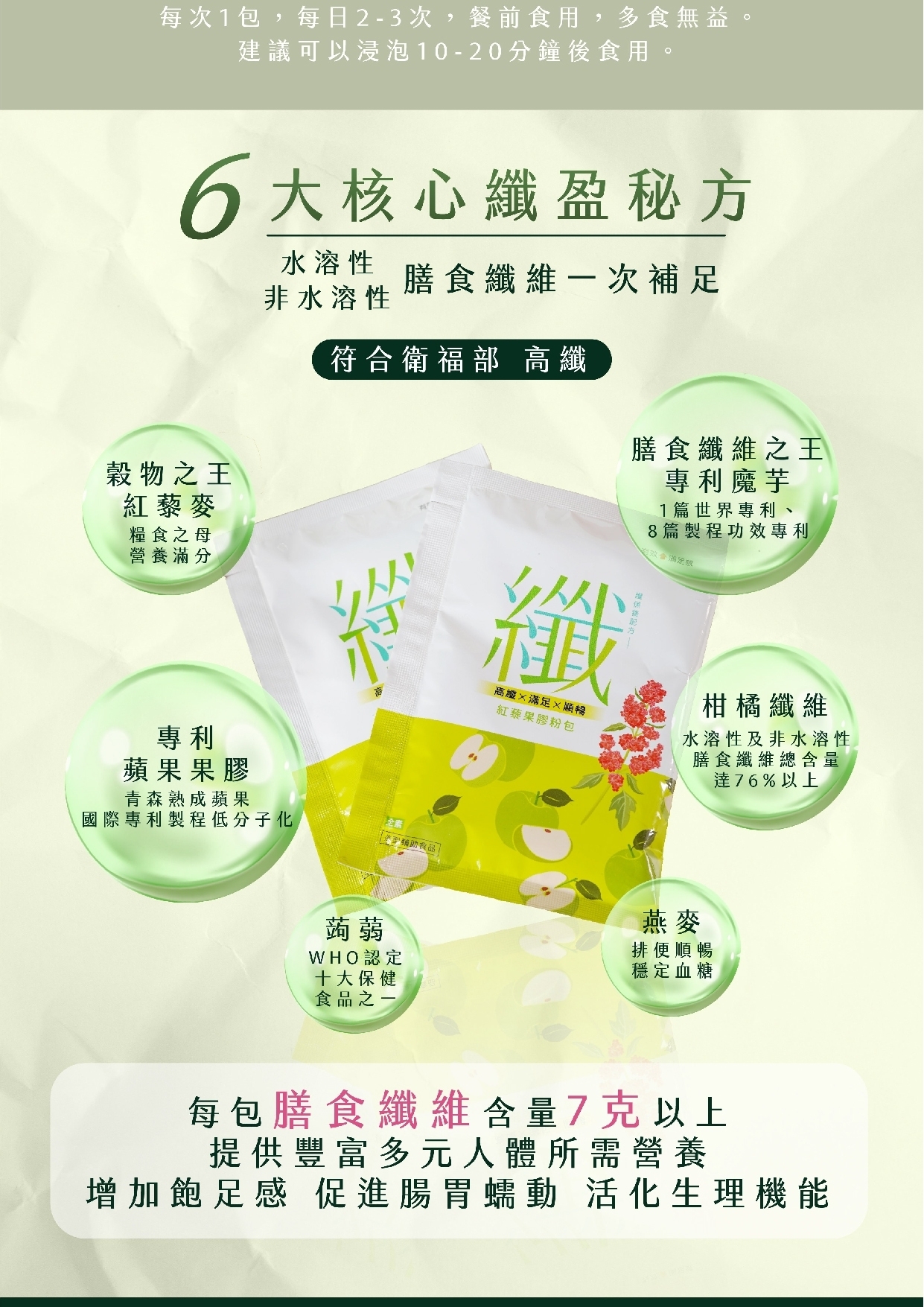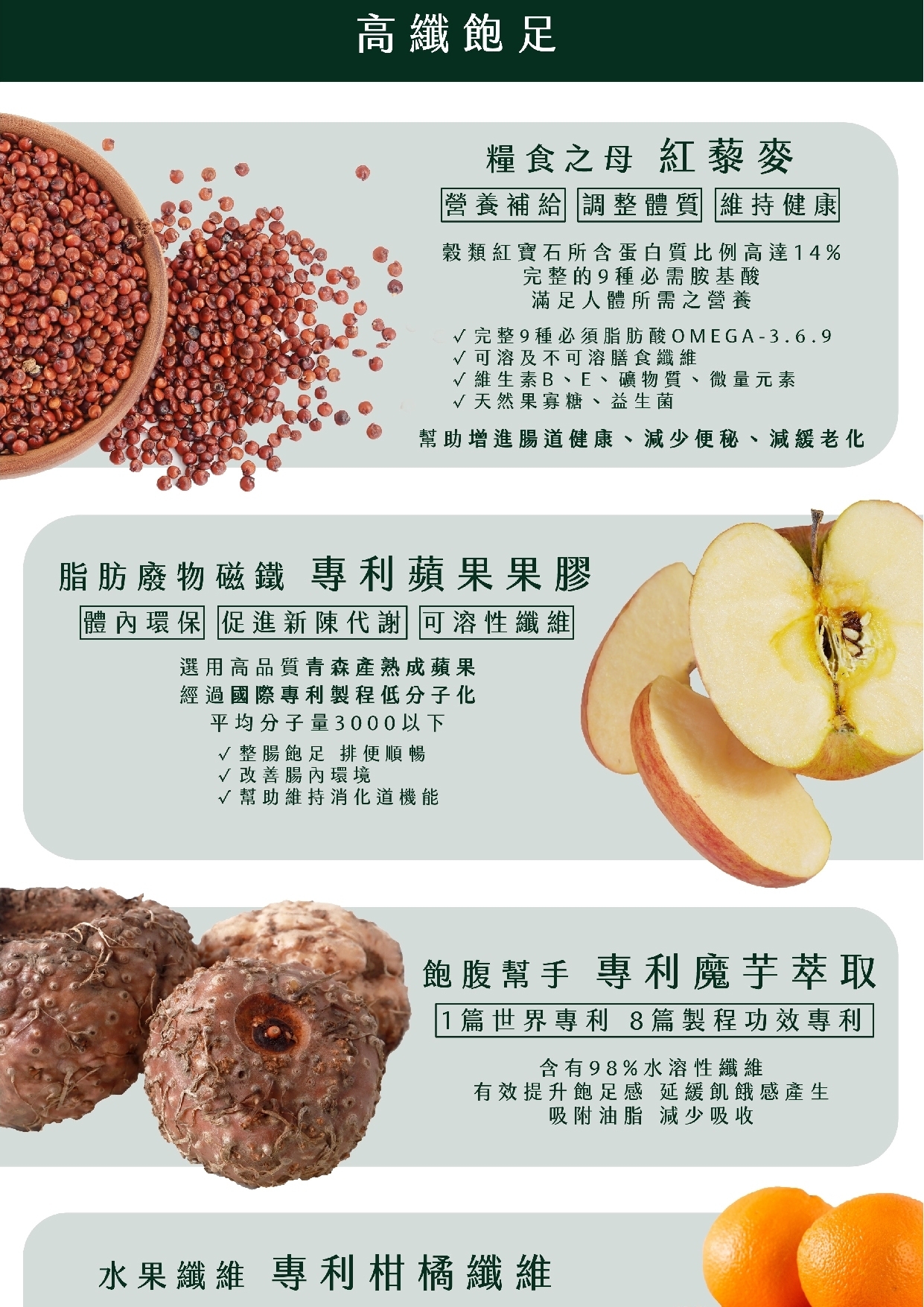 玉米來源可溶性纖維、青蘋果果汁粉(砂糖、葡萄糖、麥芽糊精、蘋果濃縮汁、檸檬酸、香料、阿拉伯膠、梔子藍色素、黃梔子色素)、紅藜麥粉、燕麥粉、大豆蛋白粉、關華豆膠、麥芽糊精、啤酒酵母粉、柑橘纖維(柑橘纖維、關華豆膠)、蒟蒻粉、維生素C、蘋果丁、魔芋精粉、五色靈芝粉[赤芝子實體粉末( Ganoderma lucidum( Leyss.: Fr.) Karst.,固態培養)、樹舌靈芝子實體粉末( Ganoderma applanatum( Pers. exWallr.) Pat.,固態培養)、桑黃子實體粉末(Phellinus linteus( Berk. et Curt) Aoshima,固態培養)、烏芝子實體粉末( Amauroderma rugosum( Bl. Et Need) Torrend,固態培養)、紫芝子實體粉末( Ganoderma japonicum( Fr.) Lloyd,固態培養、麥芽糊精]、白腎豆萃取粉(白腎豆萃取物、麥芽糊精)、鉻酵母(非活性酵母、三氯化鉻)、蘋果果膠、蔗糖素(甜味劑)、凝結芽孢桿菌[麥芽糊精、凝結芽孢桿菌( Bacillus coagulans)]、二氧化矽