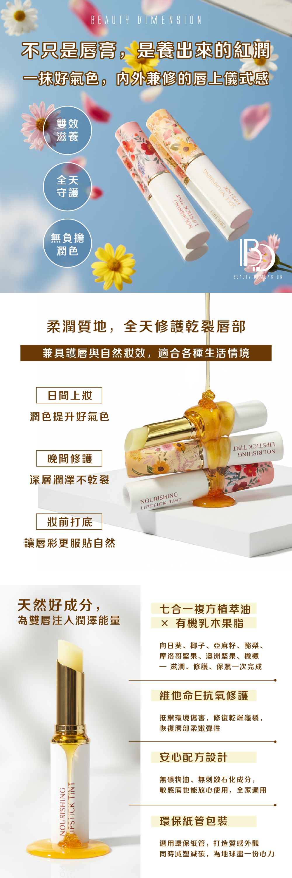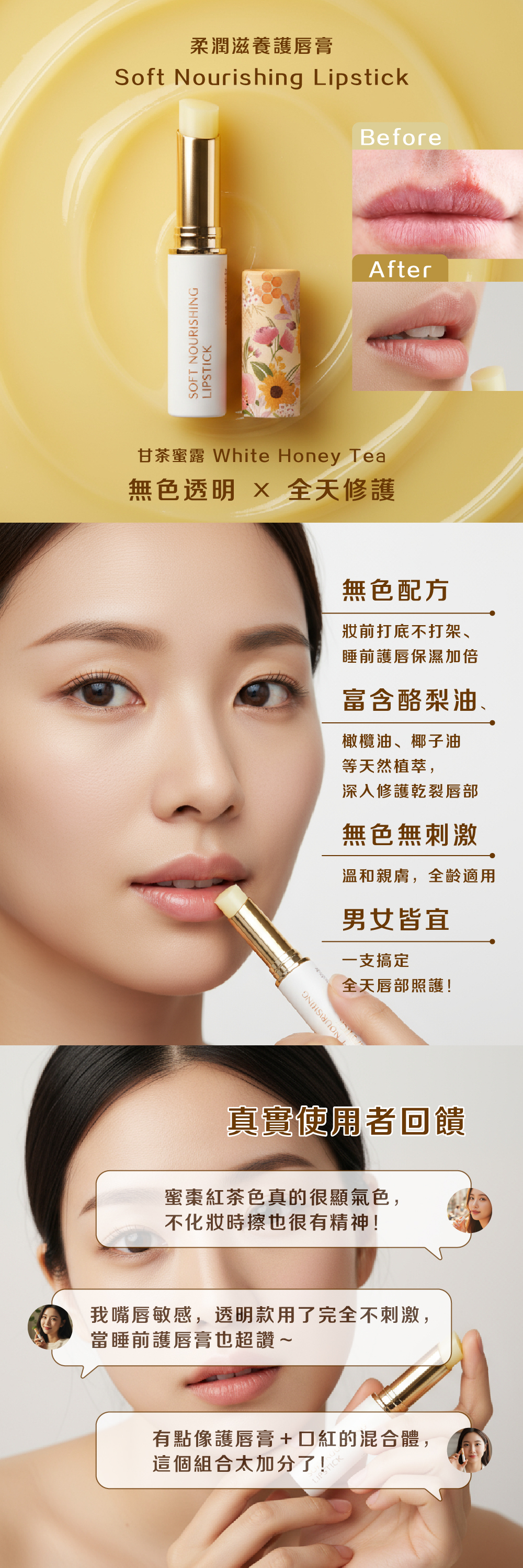 💧 七重植萃潤澤配方|含酪梨油、橄欖油、椰子油等天然油脂,高效修護乾裂唇部