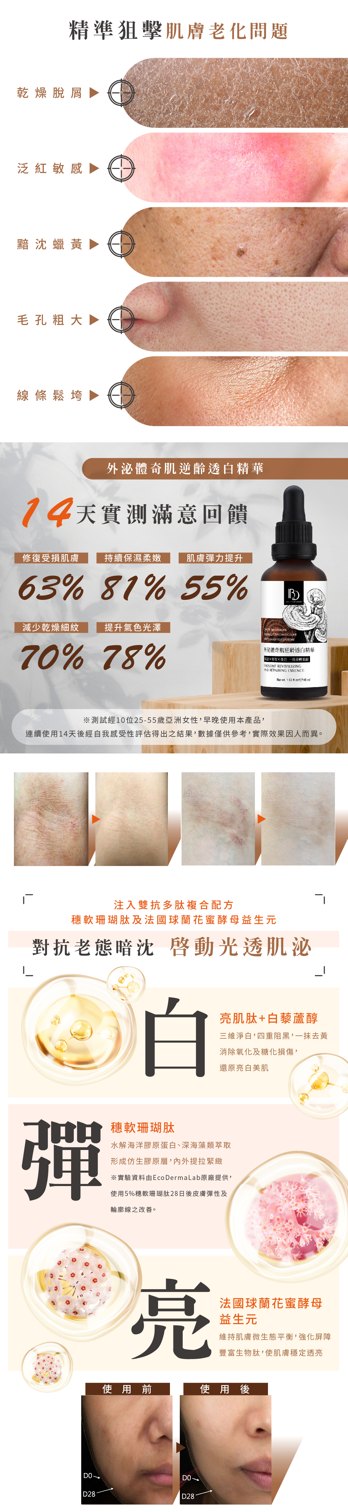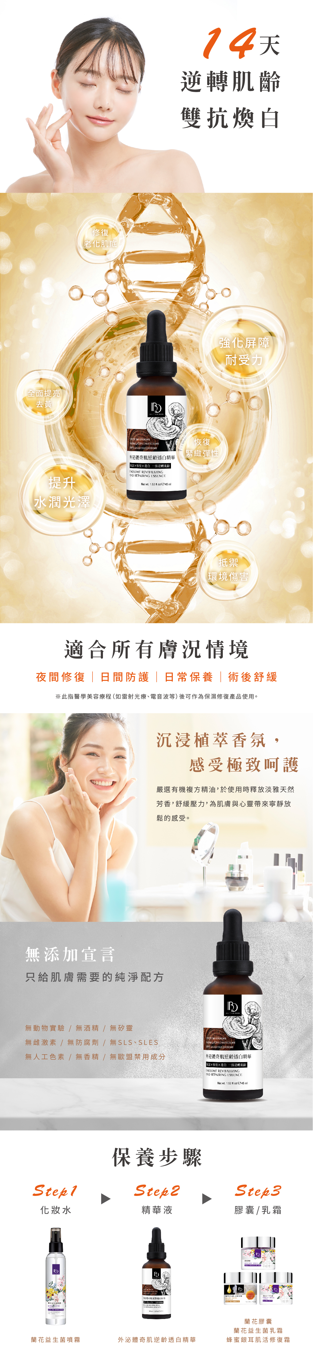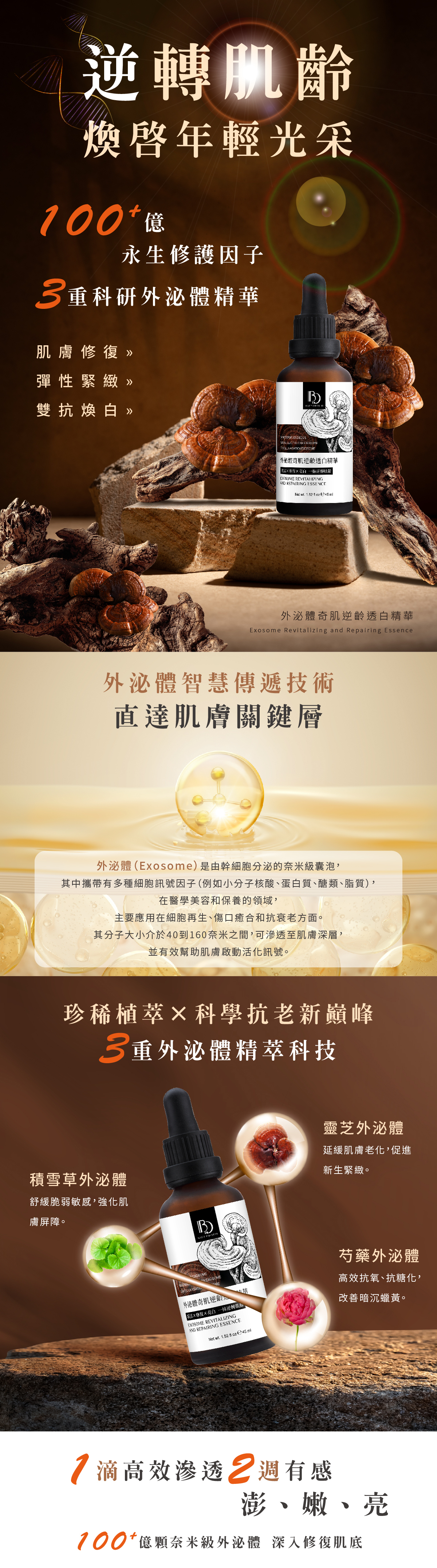 主成份:靈芝外泌體、芍藥外泌體、積雪草外泌體、 梔子花萃取 、芝麻菜葉萃取、穗軟珊瑚肽、