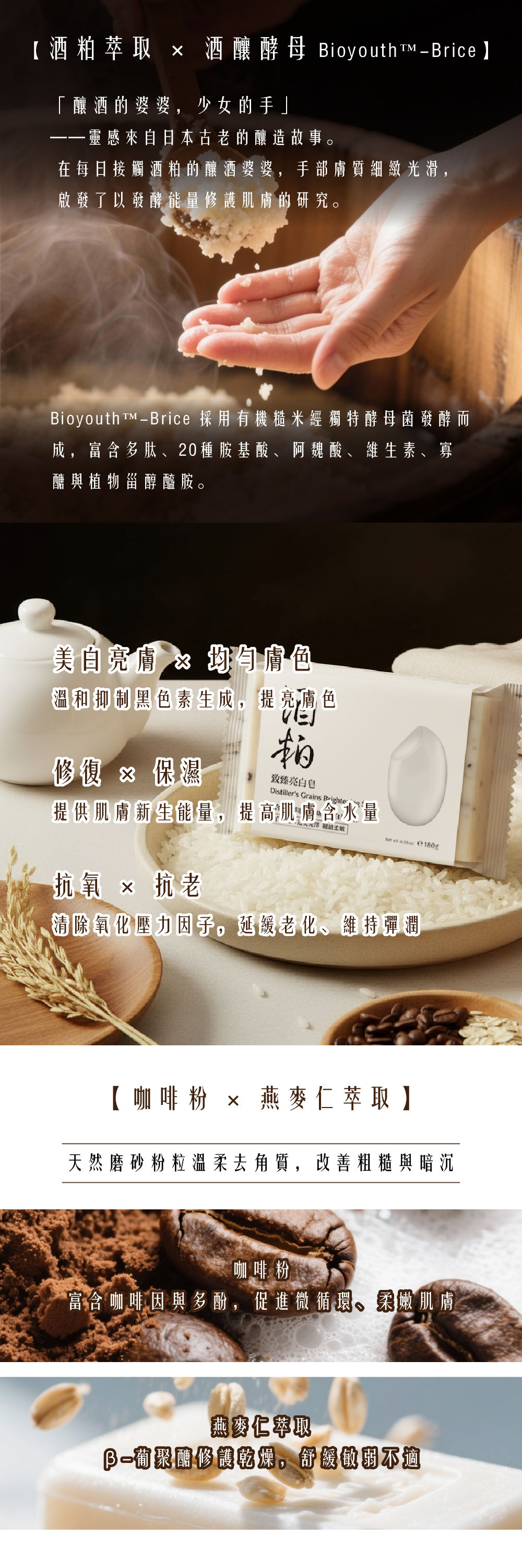 以酒粕萃取為核心,結合咖啡粉、白茶、燕麥仁與維他命B3,