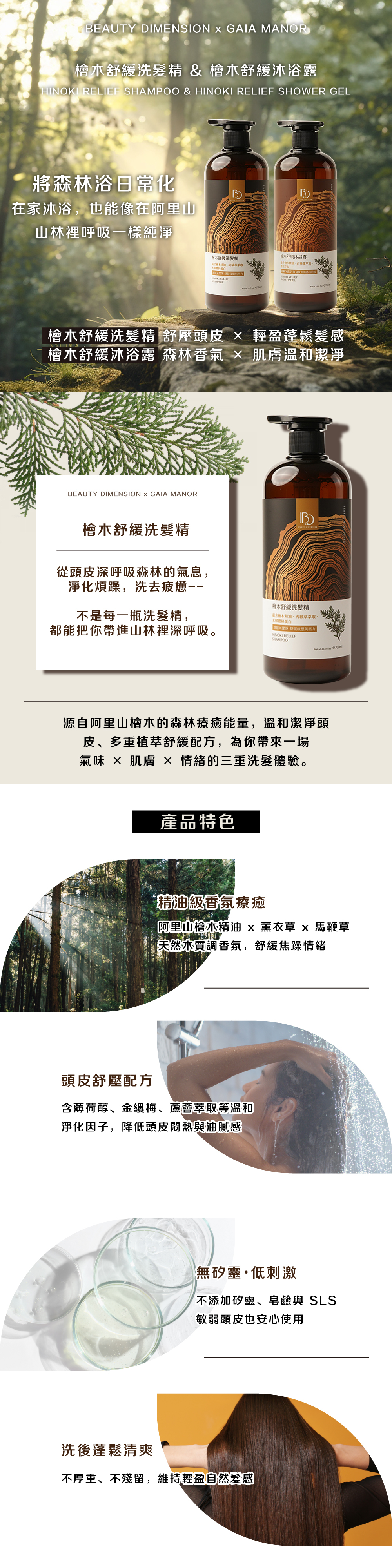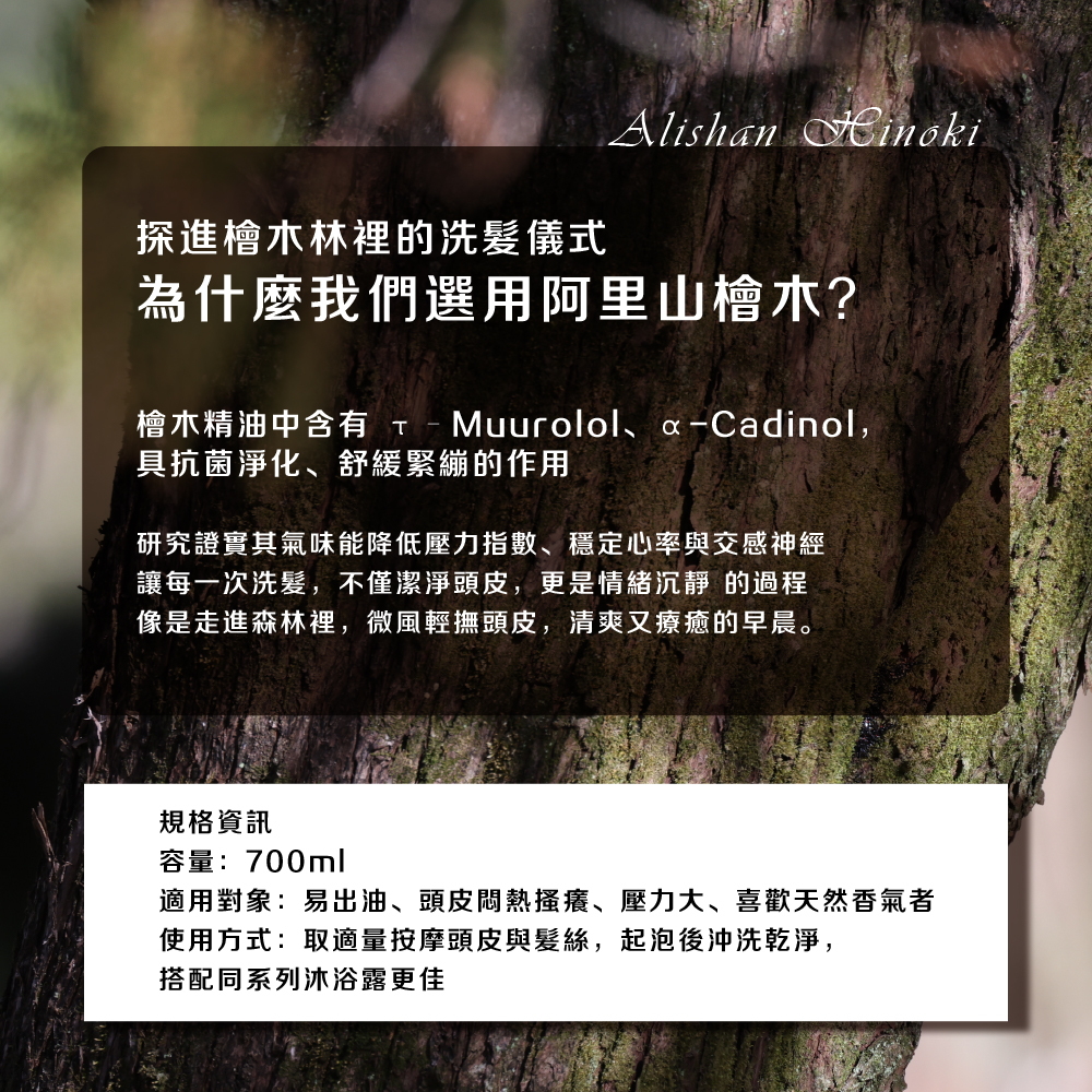 溫和洗淨毛髮及頭皮髒污,採用優質檜木精油,