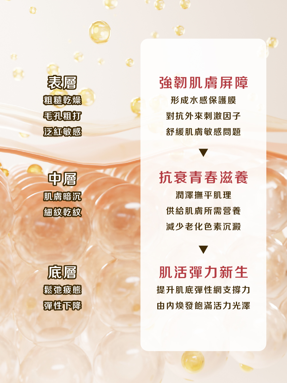 l 三胜肽: 調理安撫、修護賦活、舒緩肌膚不適感,使肌膚更加細緻有光澤。