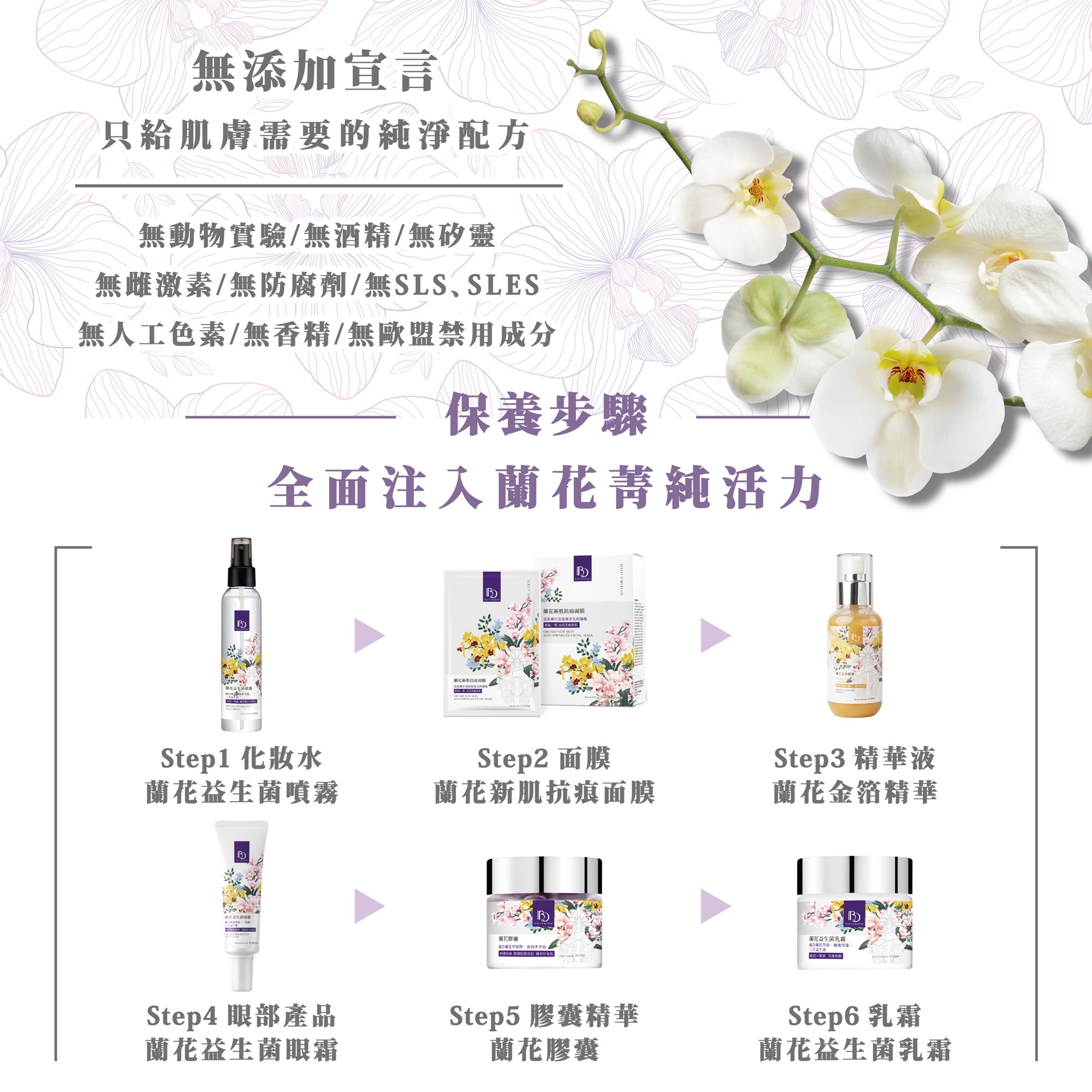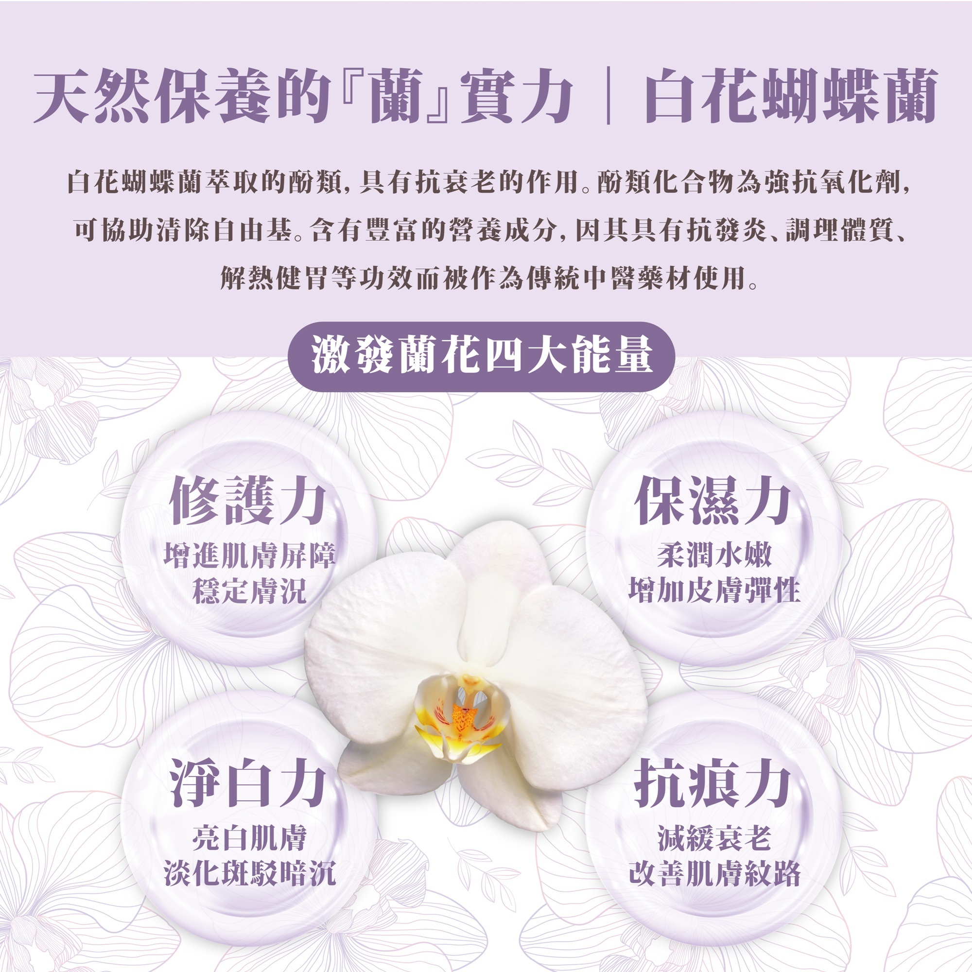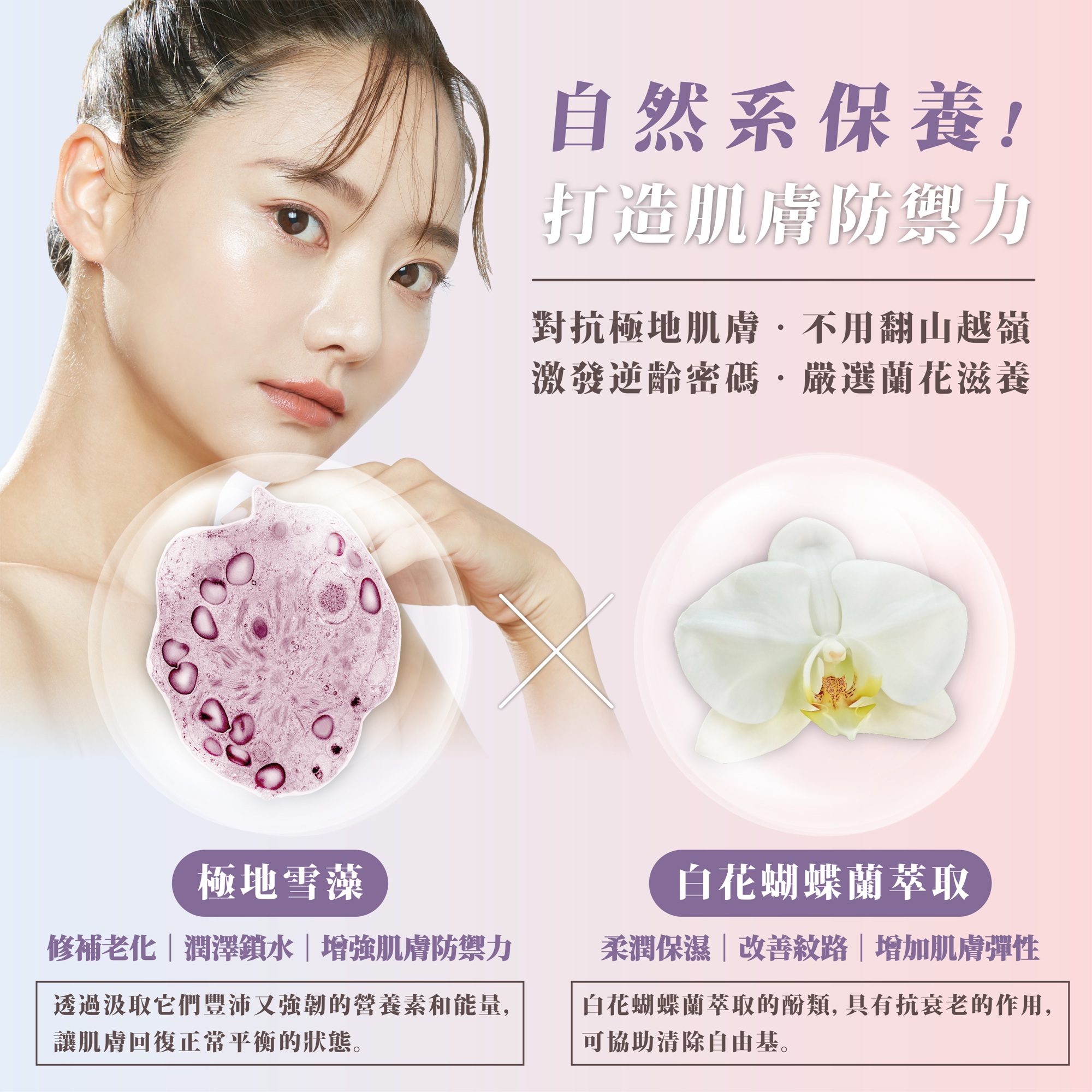 商品特色:蘭花萃取協同獨特極地雪藻,具延緩肌膚衰老,提升肌膚對環境傷害的保護力,維持肌膚健康彈潤、淡化紋路,散發由內而外的紅顏光采。