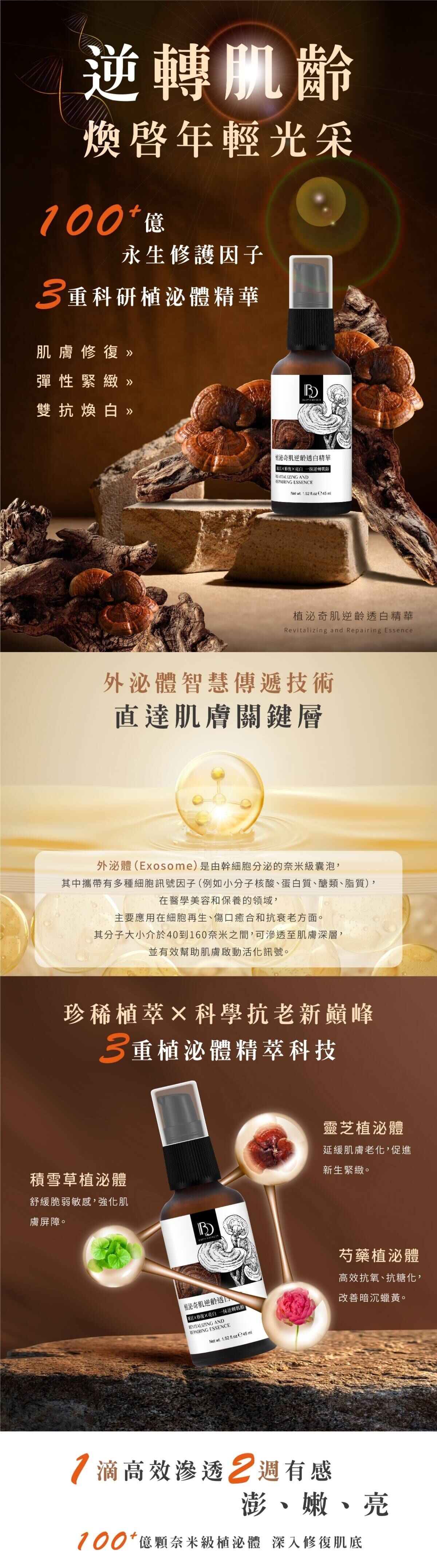 用途:蘊含三種植泌體提升肌膚修復力,淡化皺紋,延緩老化;結合高效亮白成分調理黯沉,