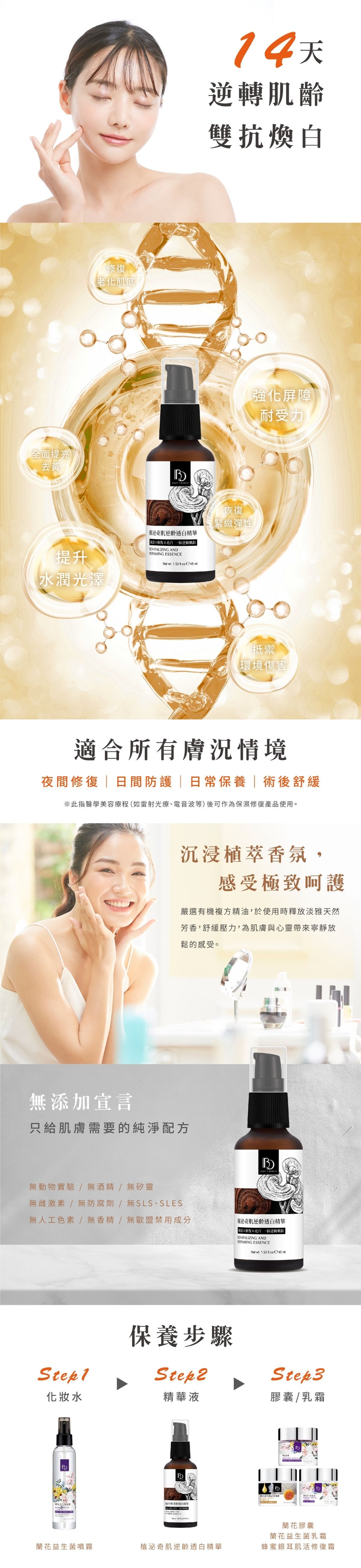靈芝植泌 × 芍藥植泌 × 積雪草植泌 — 穩定肌膚狀態,強化屏障,延緩老化與乾燥細紋生成。